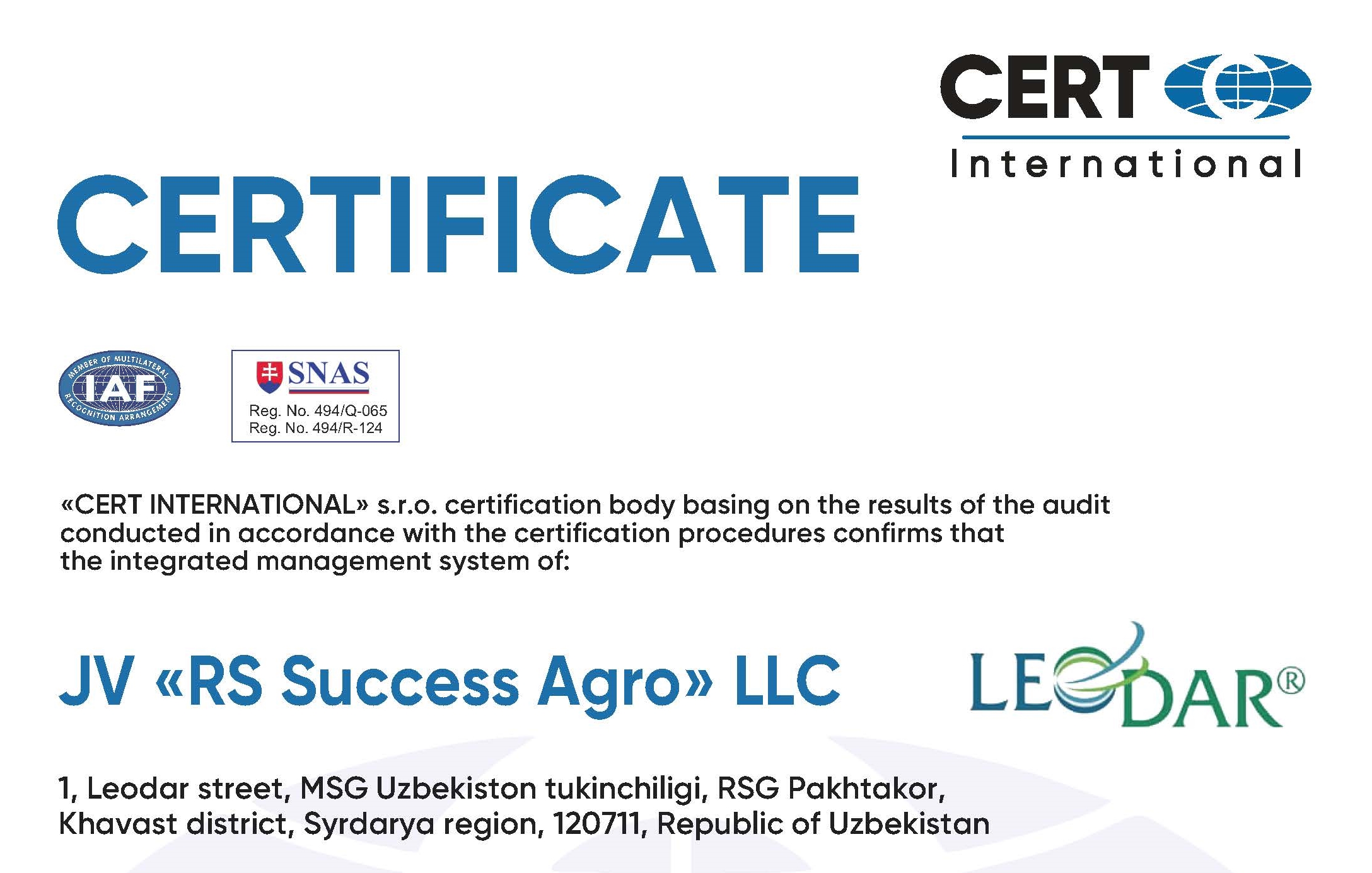 RS SUCCESS AGRO has been awarded a certificate confirming its full membership in the Chamber of Commerce and Industry of the Republic of Uzbekistan