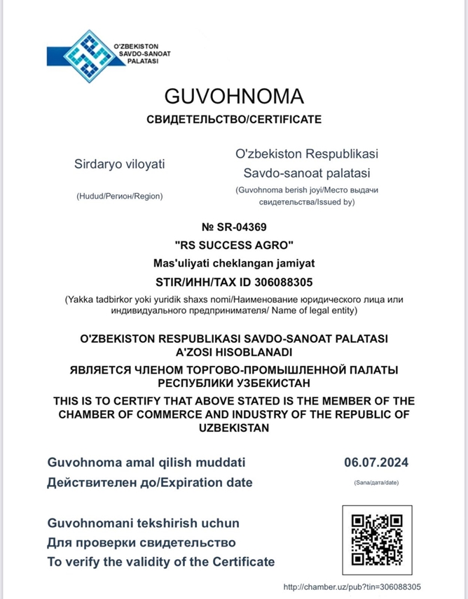 RS SUCCESS AGRO BECOMES A FULL-FLEDGED MEMBER OF THE CHAMBER OF COMMERCE AND INDUSTRY OF THE REPUBLIC OF UZBEKISTAN